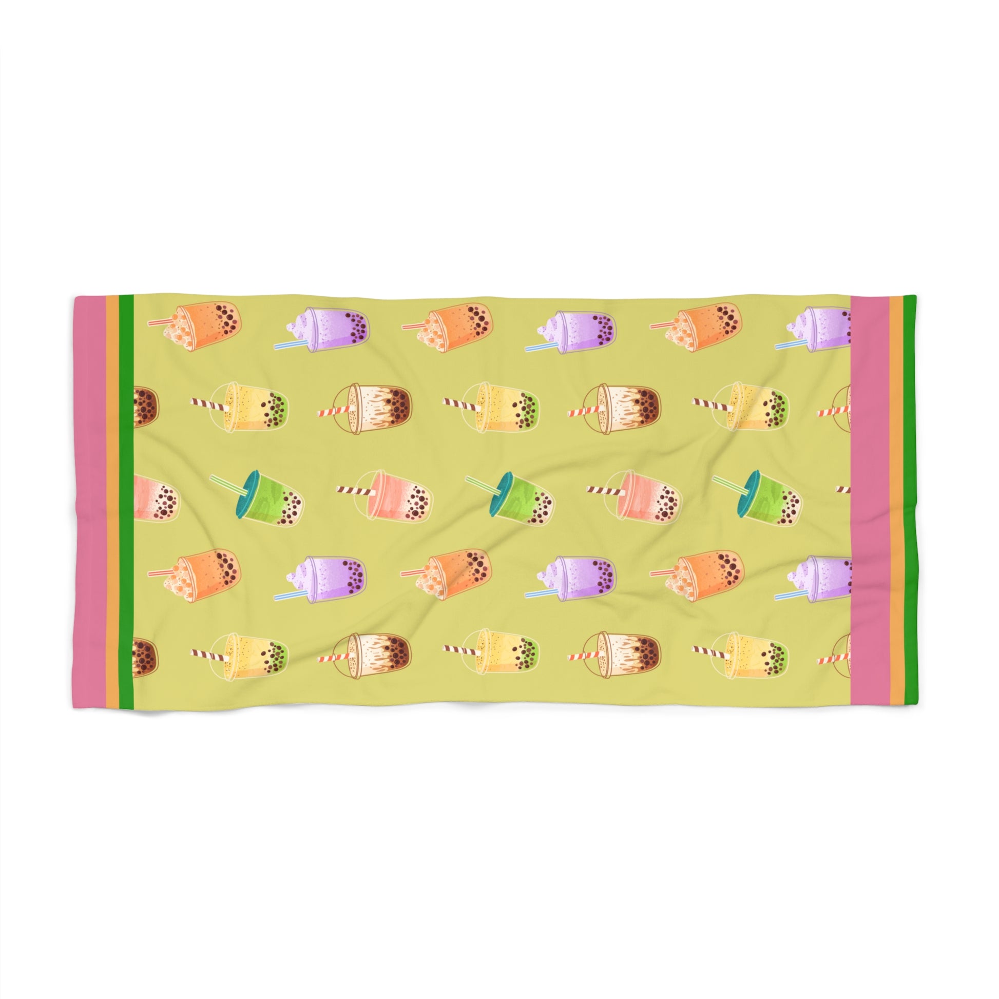 Introducing the "Milk Tea with Boba" beach towels, available in two sizes, featuring an exclusive design inspired by the beloved and trendy milk tea beverage with colorful pastel hues.