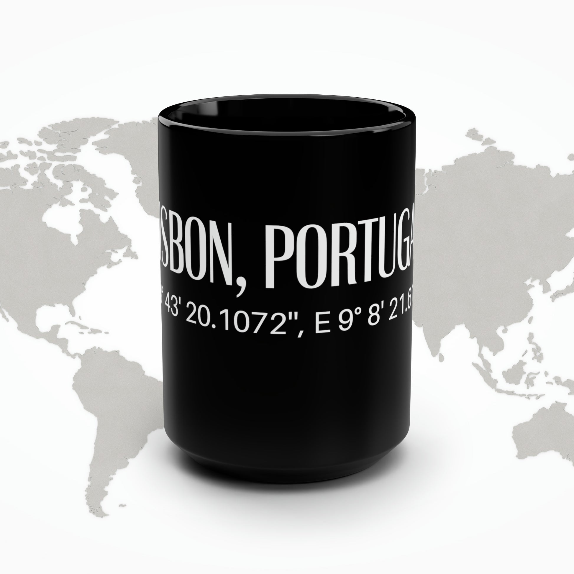 Liston, Portugal coordinates mug. Reminisce fond memories of the beautiful city while enjoying your favorite hot beverage. Jerónimos Monastery, St. Goerge's Castle, Belém, Food, etc.!