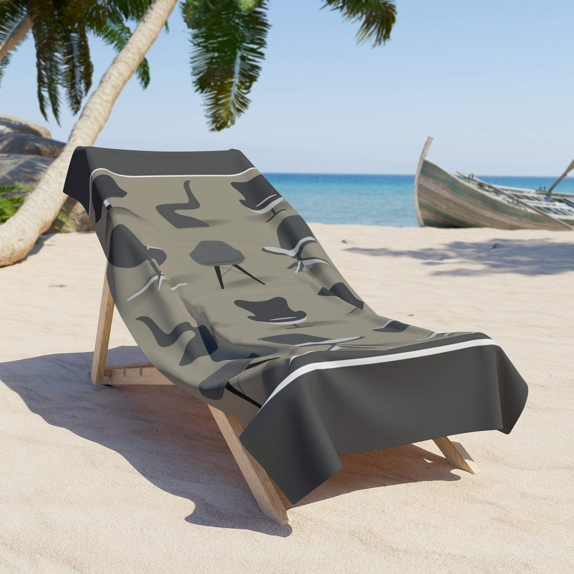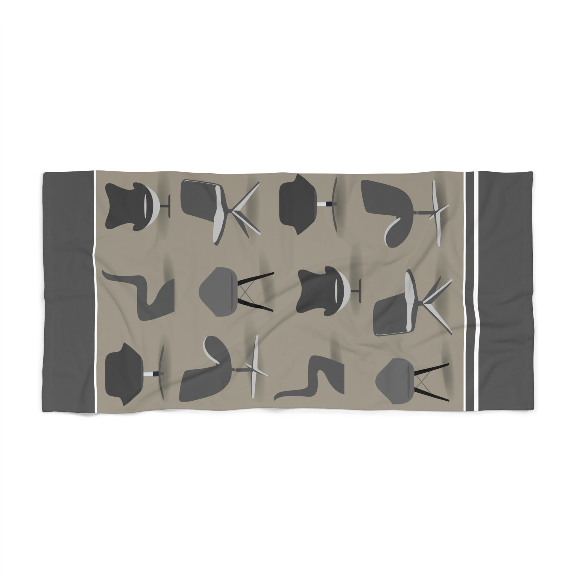 Crafted from a luxurious blend of 50% polyester and 50% cotton, these towels offer a soft and comfortable feel. With a stylish one-side print showcasing a collection of distinctive Mid Century Modern chairs, beachgoers can now bring a touch of timeless design and sophistication to their beach outings, making a statement that celebrates the artistry and elegance of these iconic furniture pieces.