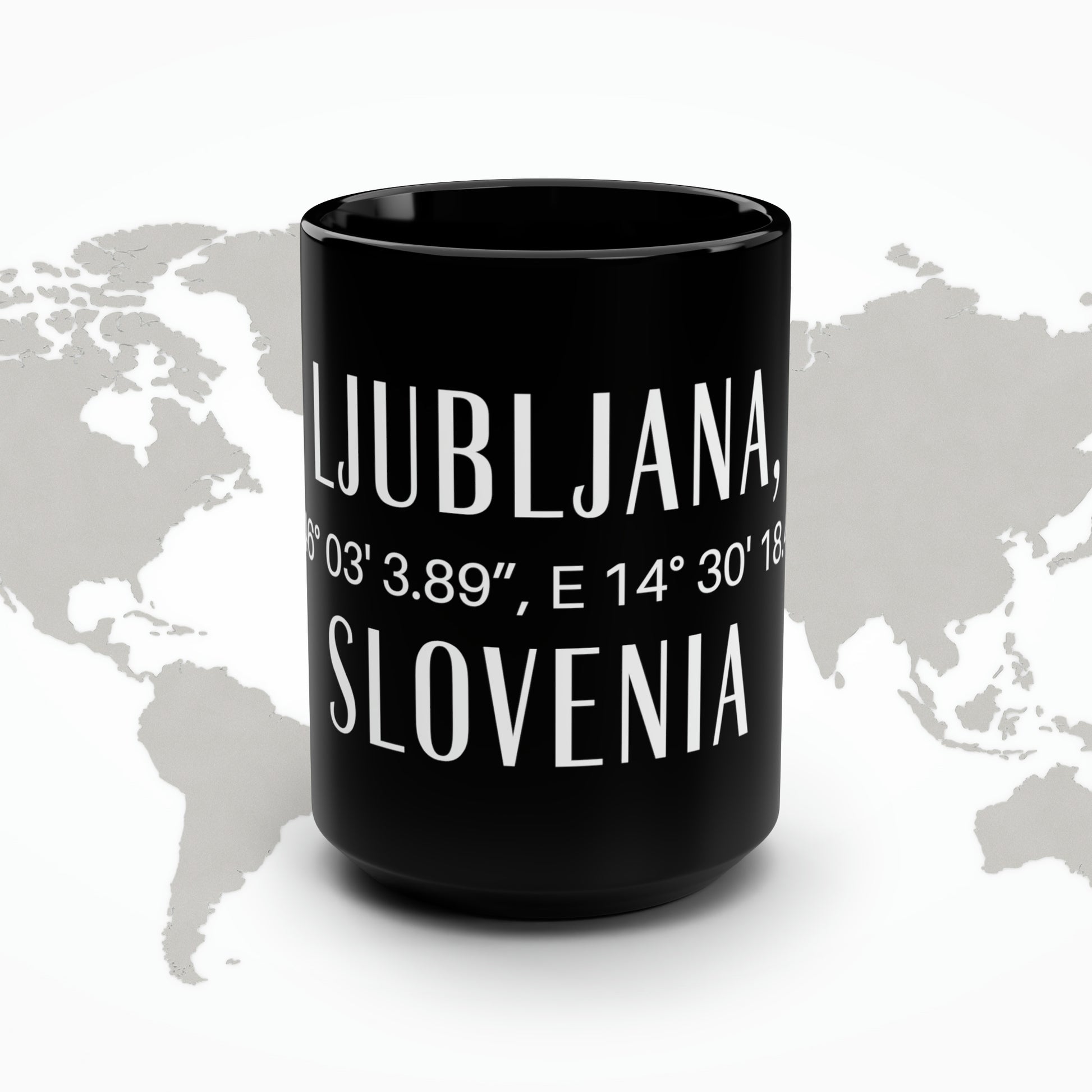 Elevate your sipping experience with this captivating black mug featuring the coordinates of Ljubljana, the capital of Slovenia.