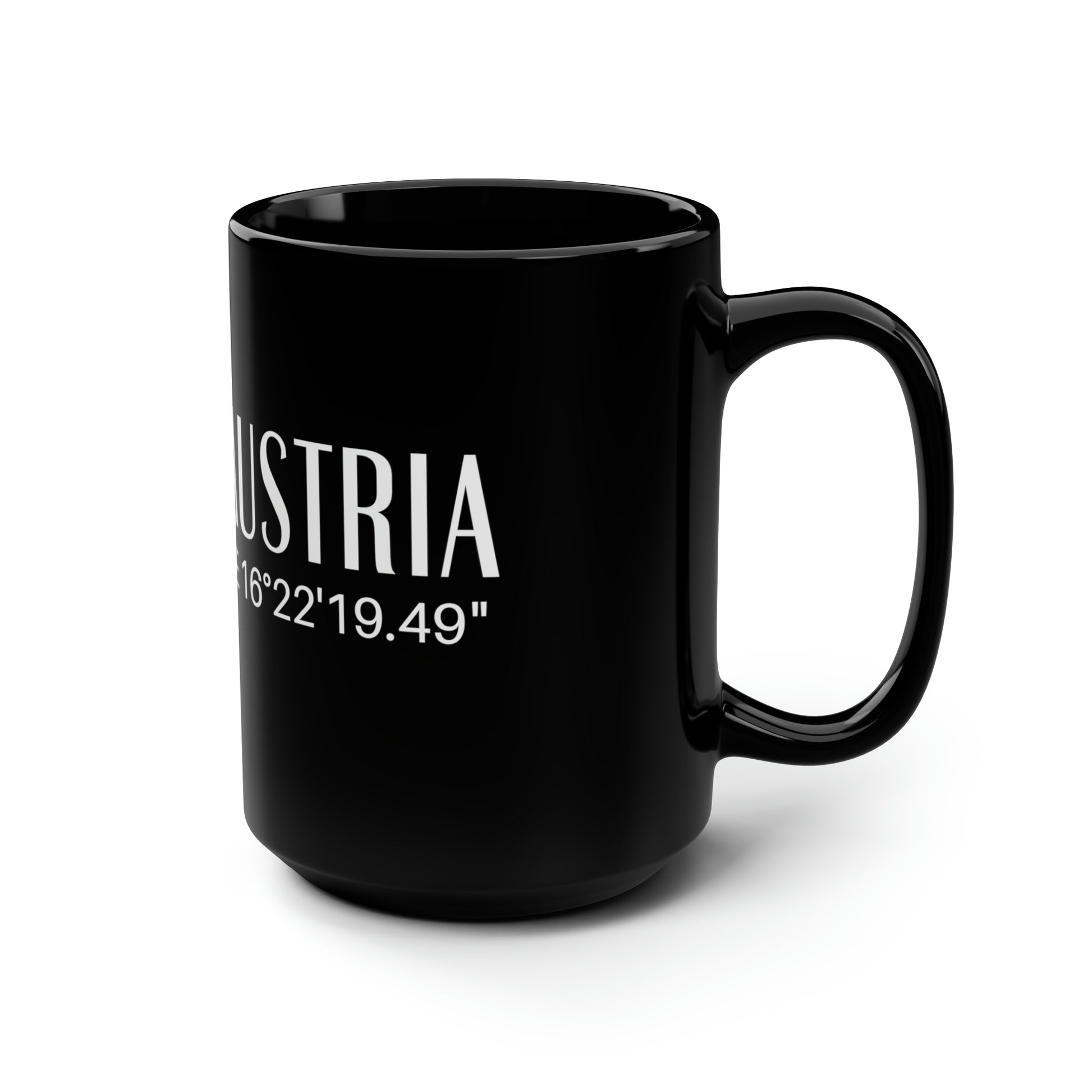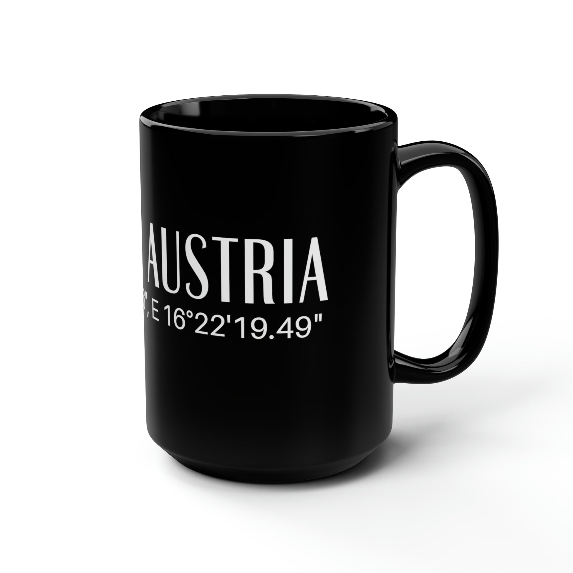Vienna, Austria coordinates mug. Reminisce fond memories of the beautiful city while enjoying your favorite hot beverage. Hofburg Palace, St. Stephen's Cathedral, Parliment Building, Food, etc.!